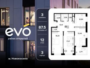 Продается трекомнатная квартира 87.54 кв.м. в жилом комплексе EVO на 12 этаже по адресу: Московская область, г. Реутов, ул. Комсомольская. Скидка 10% на пул квартир!*EVO - проект комфорт-класса от девелопера Dogma. Каждый житель сможет открыть для себя максимум возможностей. Совершенствоваться во всех направлениях: физическом, эмоциональном и материальном. В EVO можно открыть для себя новые виды спорта, найти единомышленников по хобби, партнеров по бизнесу, развивать в детях новые грани, наслаждаться природой и лаконичной архитектурой.Более 6 га благоустройства в первой очереди!- Зеленый двор без машин, кленовая аллея для прогулок.- Нейродинамические площадки для детей разных возрастов.- Workout зона, столы для пинг-понга, места для занятия йогой. велодорожки и дорожки для скандинавской ходьбы.- Детский сад на 180 мест и школа на 750 мест.- Кроссбукинг.- Лобби с зоной ожидания, колясочной и лапомойкой.- Магазины и кафе на первых этажах.БЕЗОПАСНОСТЬ- Закрытая территория.- Круглосуточное видеонаблюдение.- Контроль доступа.РАСПОЛОЖЕНИЕПешком- 7 минут до станции Реутов.- 20 минут до метро Новокосино.На машине- 4 минуты до МКАД.- 6 минут до шоссе Энтузиастов.- 9 минут до Носовихинское шоссе.- 13 минут до МСД (Московский скоростной диаметр).СОЦИАЛЬНАЯ ИНФРАСТРУКТУРАВ первой очереди предусмотрено строительство детского сада на 180 мест и школы на 750 учащихся. В 10 минутах ходьбы от EVO находится детский технопарк ''Изобретариум'', в котором более 60 научных секции: от IT до промышленного дизайна. Для творческих ребят рядом есть художественная и музыкальные школы, хоровая студия.ОКРУЖЕНИЕ- Реутовский центральный парк, Александровский сквер, Фабричный пруд.- ТЦ ''Экватор'', ТК ''Шоколад''.- Спортивный комплекс ''Старт'', Ледовый комплекс ''Реутов Арена''.- Музей-усадьба ''Кусково''.*Скидка 10% на выделенный пул квартир действительна при покупке в ипотеку.