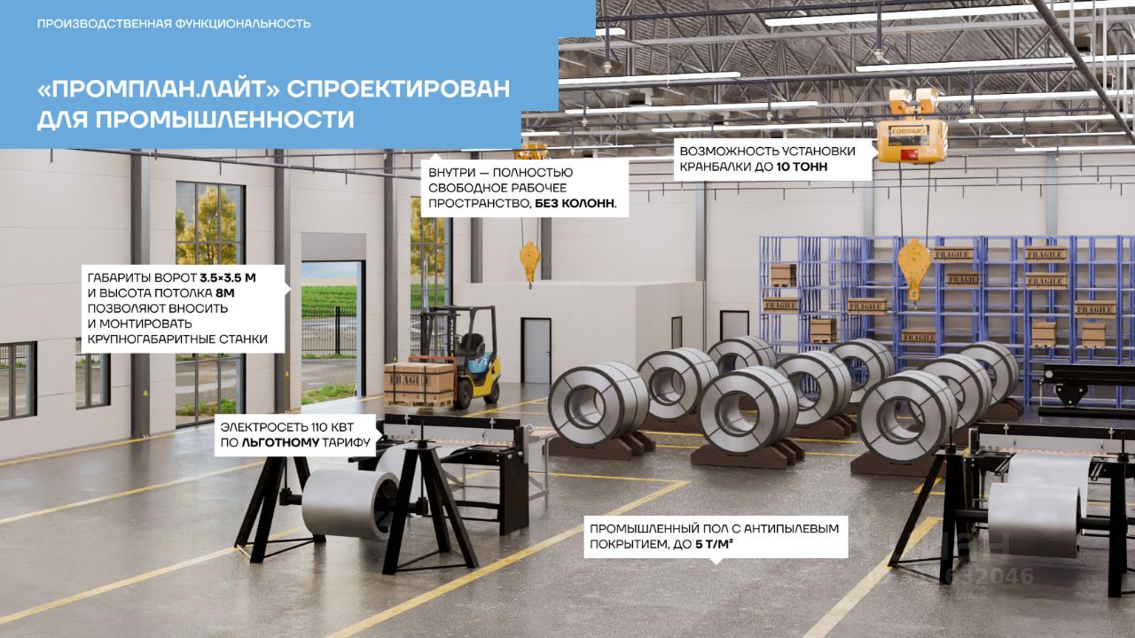 Продается производственно-складское помещение 1440 м² в Индустриальном парке ''Затишье'', в Богородском округе, Московская область. Формат объекта — Light Industrial, подходит под склад, производство, логистику, дистрибуцию, хранение товаров и размещение производственных линий. Цена и условия: Стоимость: 90 000 руб./м² (включая НДС) Возможна рассрочка на 12 месяцев (условия уточняйте) Продажа от собственника, без комиссии Управление объектом осуществляет управляющая компания ''Промплан.