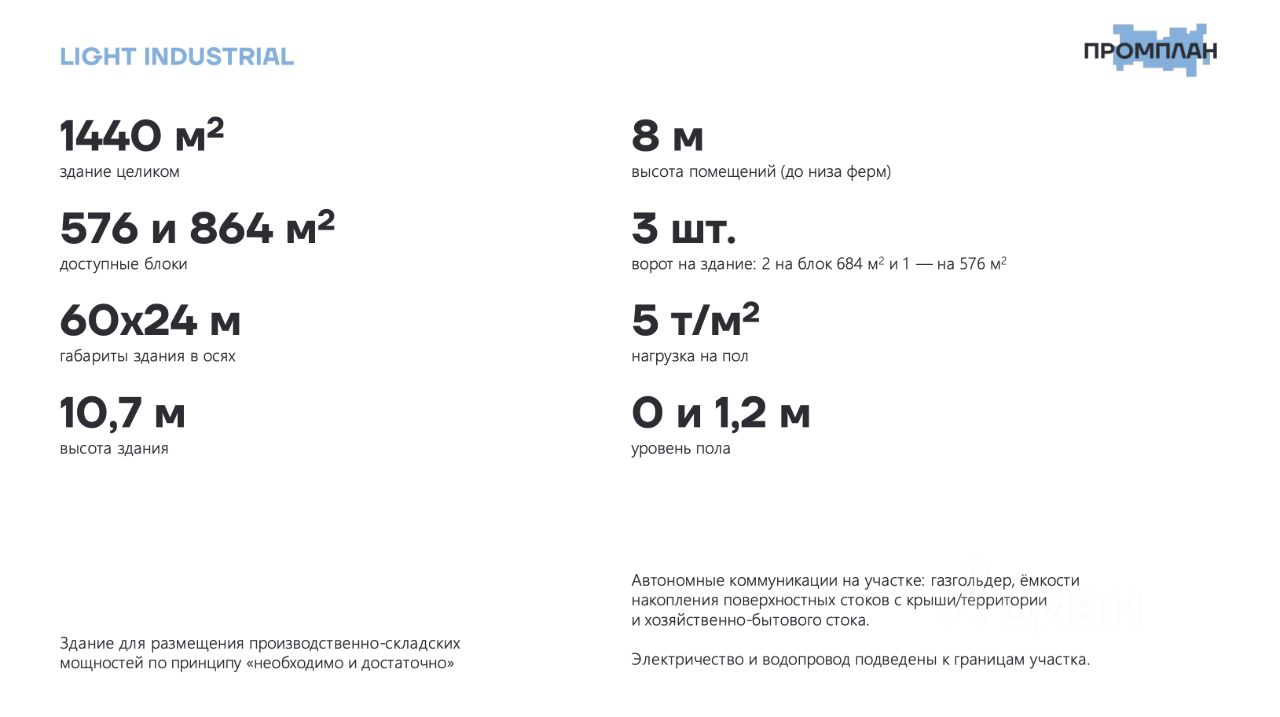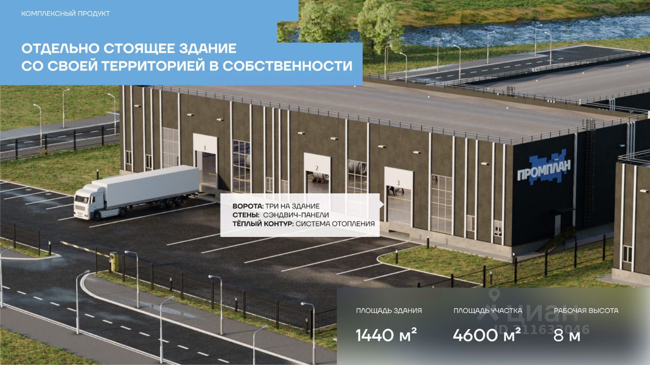 Продается производственно-складское помещение 1440 м² в Индустриальном парке ''Затишье'', в Богородском округе, Московская область. Формат объекта — Light Industrial, подходит под склад, производство, логистику, дистрибуцию, хранение товаров и размещение производственных линий. Цена и условия: Стоимость: 90 000 руб./м² (включая НДС) Возможна рассрочка на 12 месяцев (условия уточняйте) Продажа от собственника, без комиссии Управление объектом осуществляет управляющая компания ''Промплан.Сервис'' При необходимости — поиск арендаторов, помощь в юридическом сопровождении сделки, подключение к коммуникациям, проектирование дополнительных объектов Основные характеристики: Общая площадь: 1440 м² Формат: одноэтажное отапливаемое здание Высота потолков: 8 м, шаг колонн: 1224 м Полы: бетонные, антипылевое покрытие, нагрузка — до 5 т/м² (возможность усиления до 8 т/м²) Погрузка-разгрузка: въезд под фуру, ворота 3,54,5 м, высота пола 1,2 м (доковый уровень), возможна адаптация под рампу Электроснабжение: от 110 кВт (возможность увеличения до 20 МВт) Газоснабжение: до 10 000 м/сутки Водоснабжение и канализация: до 500 м/сутки Парковка: предусмотрены места для легкового и грузового транспорта Локация: ЦКАД 2 км, М12 7 км, БКЛ 20 км, МКАД 48 км