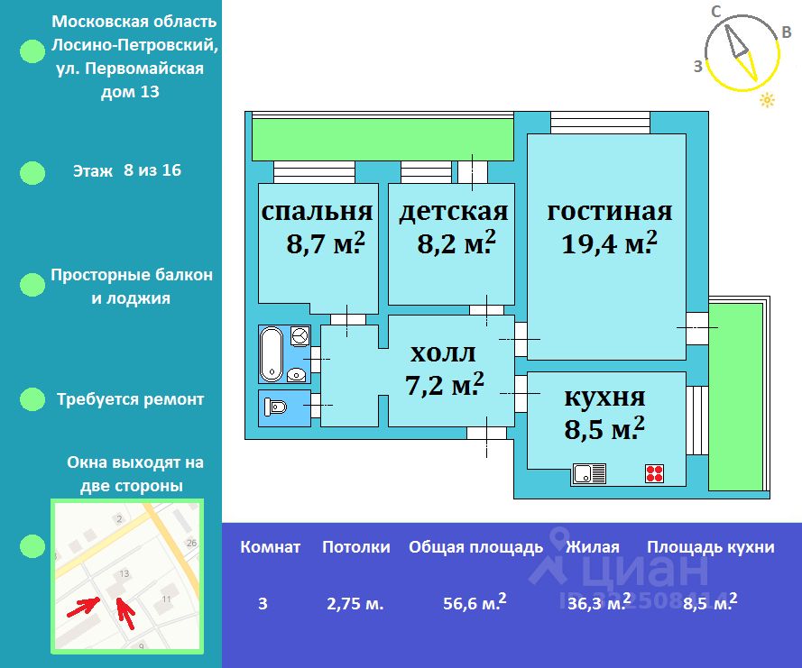 Общая площадь56,6 м2